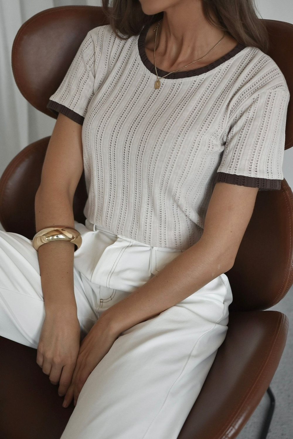 Stylowy t-shirt wykonany z delikatnej, ażurowej tkaniny, która pięknie układa się na sylwetce i dodaje stylizacji lekkości. Pionowa struktura materiału subtelnie wysmukla, a kontrastowe wykończenia nadają całości eleganckiego charakteru. Idealny zarówno do jeansów, jak i bardziej kobiecych, dopracowanych stylizacji.