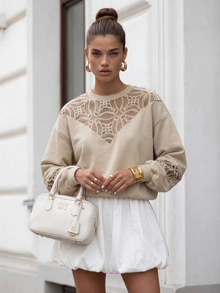 Stylowa bluza wykonana z wysokiej jakości materiału. Jej wyjątkowym elementem są delikatne, półtransparentne koronkowe wstawki, nadające całości subtelnej lekkości i elegancji. Model wykończony jest praktycznymi ściągaczami przy rękawach oraz u dołu, dzięki czemu dobrze układa się na sylwetce. To świetna propozycja do codziennych stylizacji – idealnie komponuje się zarówno z jeansami, jak i bardziej eleganckimi elementami garderoby.
