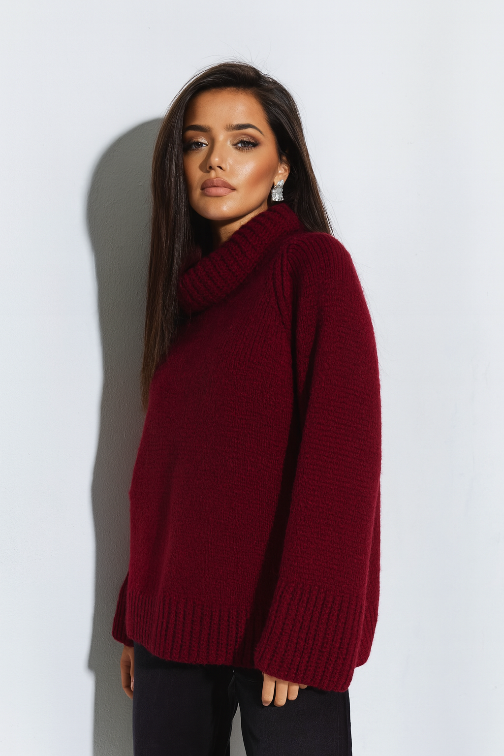 Bordowy sweter damski z obszernym golfem wykonany z miękkiej, przytulnej przędzy. Model o luźnym kroju z szerokimi rękawami doskonale układa się na sylwetce i zapewnia pełen komfort noszenia. Idealny do stylizacji jesienno-zimowych – świetnie prezentuje się zarówno z eleganckimi spodniami, jak i codziennymi jeansami. Ciepły, miękki i stylowy, będzie niezastąpionym elementem kobiecej garderoby.