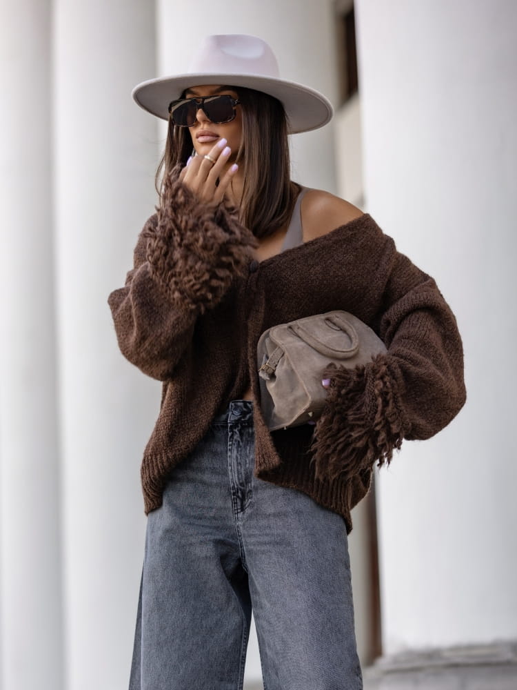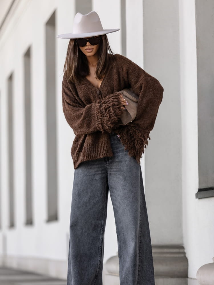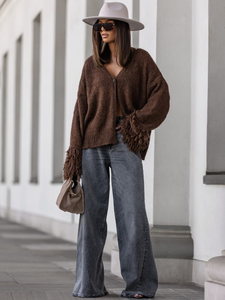 Brązowy kardigan damski oversize z frędzlami na rękawach Cocomore