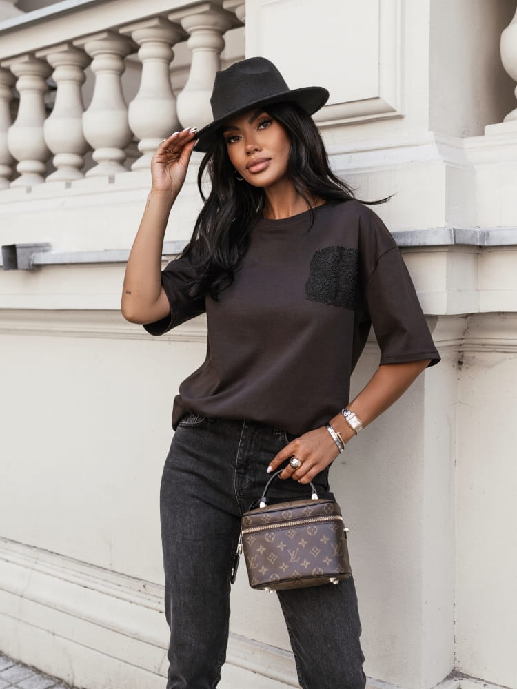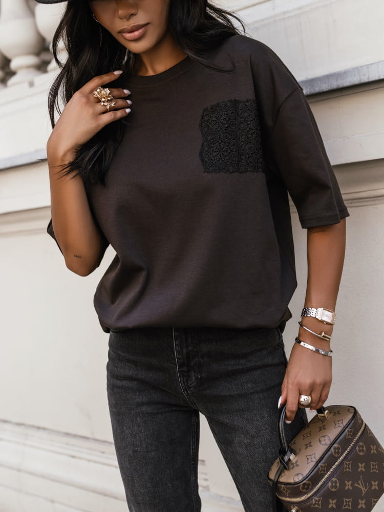 Brązowy t-shirt z koronkową kieszonką Cocomore
