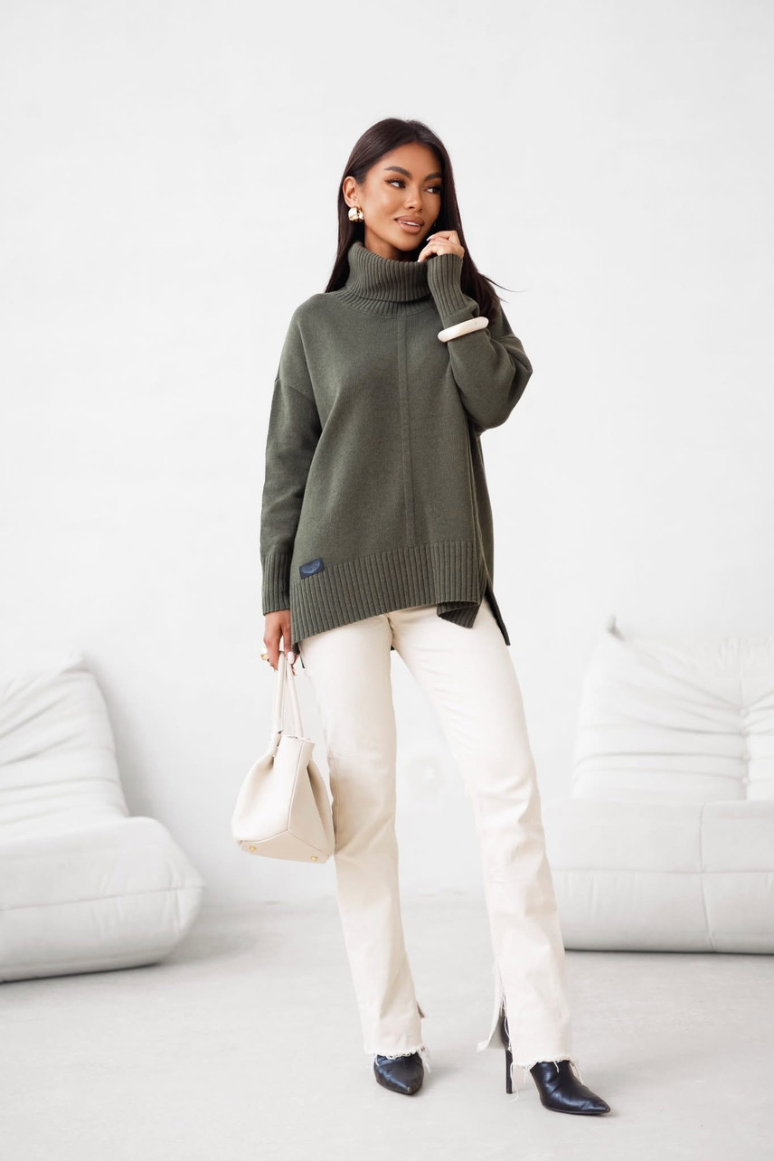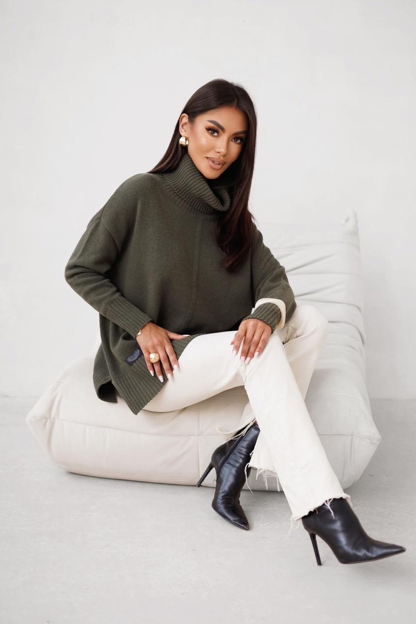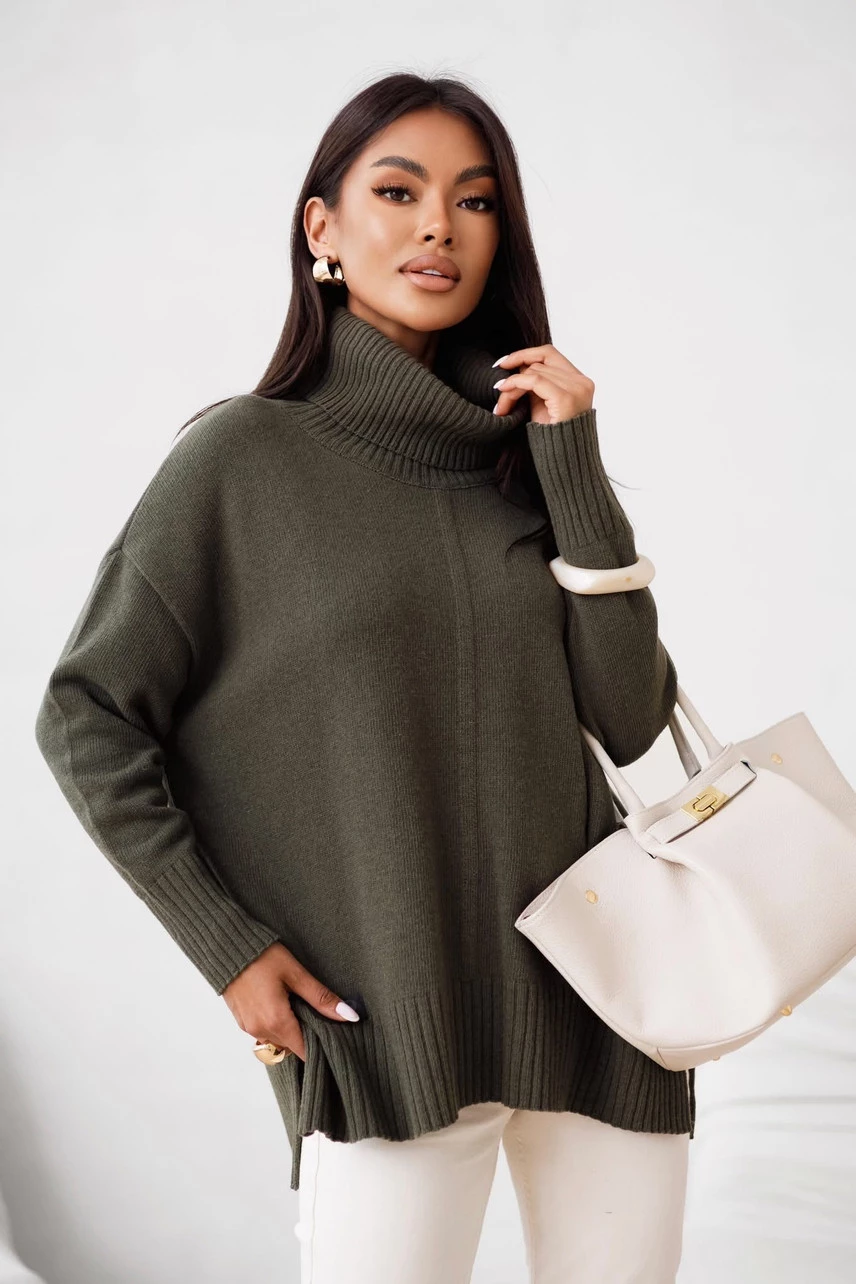 Sweter damski oversize w kolorze khaki z golfem to idealne połączenie stylu, wygody i elegancji. Pięknie układa się na sylwetce, a luźniejszy fason zapewnia swobodę ruchów i komfort noszenia przez cały dzień. Golf dodaje stylizacji szyku, jednocześnie chroniąc przed chłodem – świetnie sprawdzi się jesienią i zimą. Dłuższy krój z rozcięciami po bokach optycznie wysmukla sylwetkę i pozwala nosić sweter zarówno do legginsów, jak i dopasowanych spodni czy spódnic. Głęboki, śliwkowy kolor wygląda niezwykle kobieco i elegancko, pasuje do klasycznych stylizacji, jak i modnych total looków.