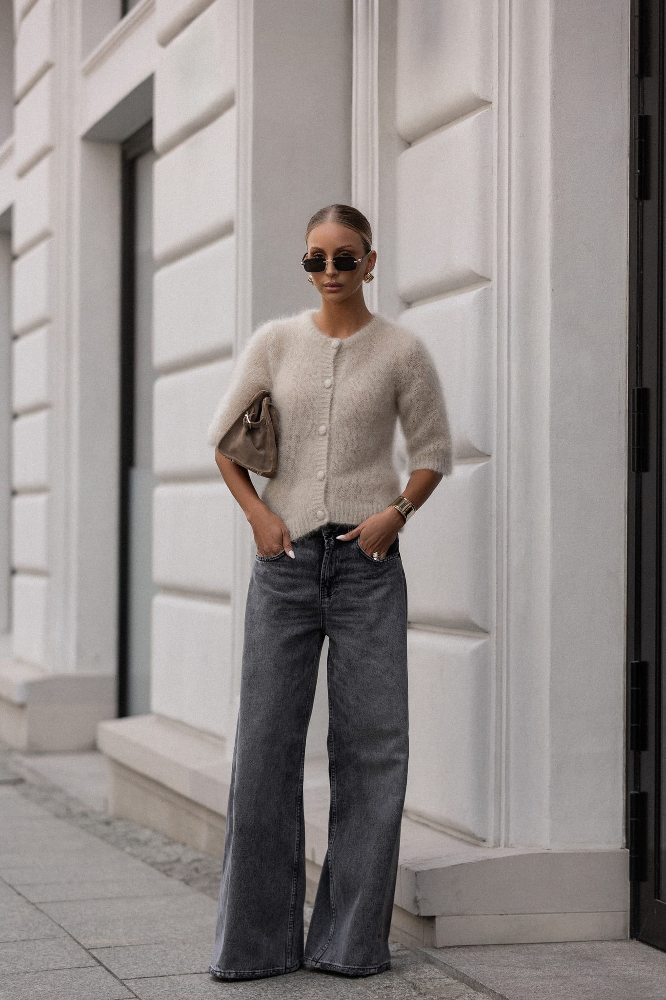 Stylowy i elegancki kardigan damski z super kid moheru w kolorze jasnobeżowym. Wykonany z luksusowej, miękkiej i puszystej przędzy, otula komfortem i dodaje klasy każdej stylizacji. Krótki fason zapinany na guziki, z rękawem ¾, sprawia, że model prezentuje się lekko i nowocześnie. To kardigan, który doskonale łączy w sobie ponadczasową elegancję i wygodę – pasuje zarówno do spodni z wysokim stanem, jak i do spódnic czy sukienek. Idealny wybór na chłodniejsze dni w stylu premium.