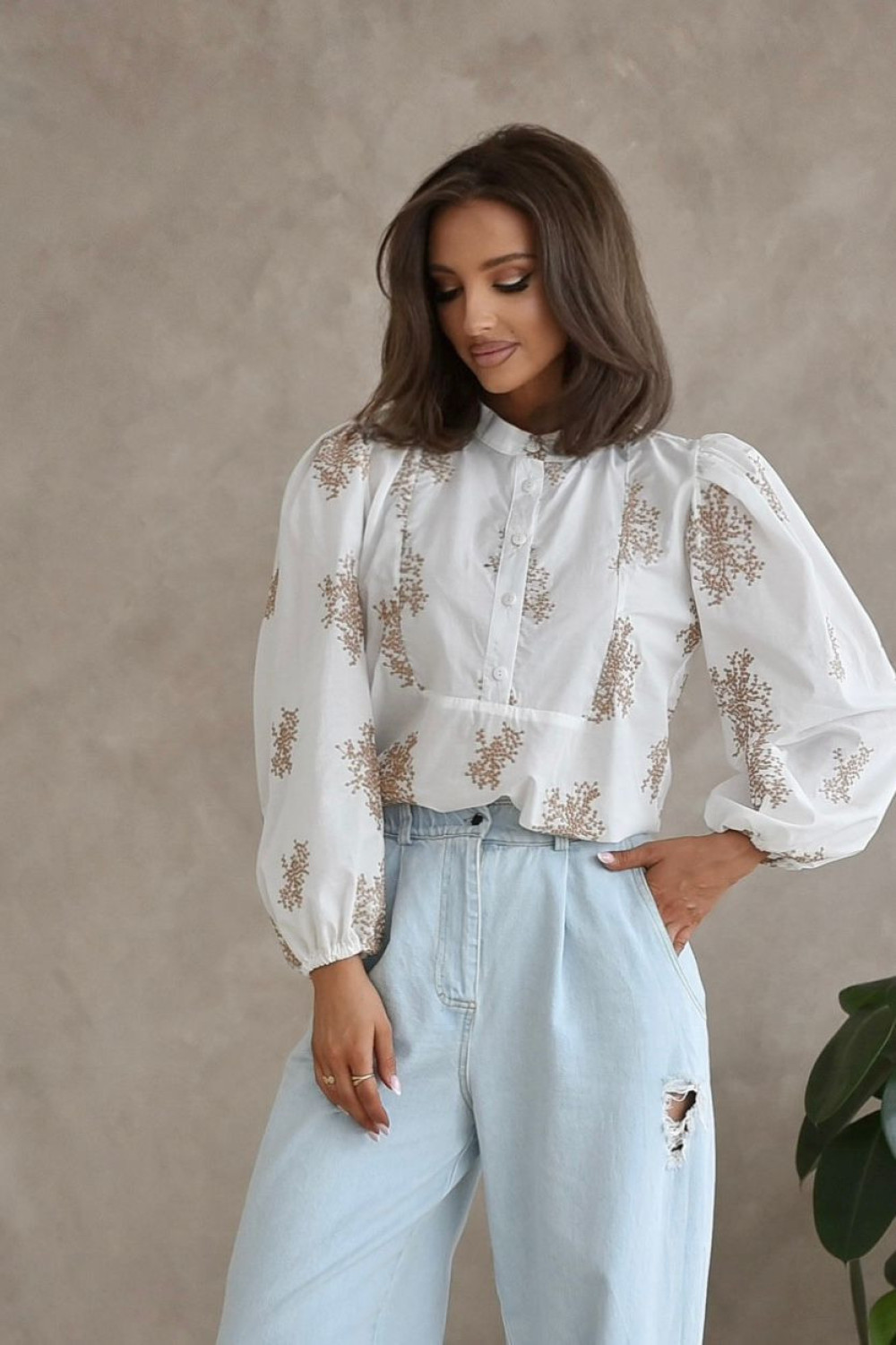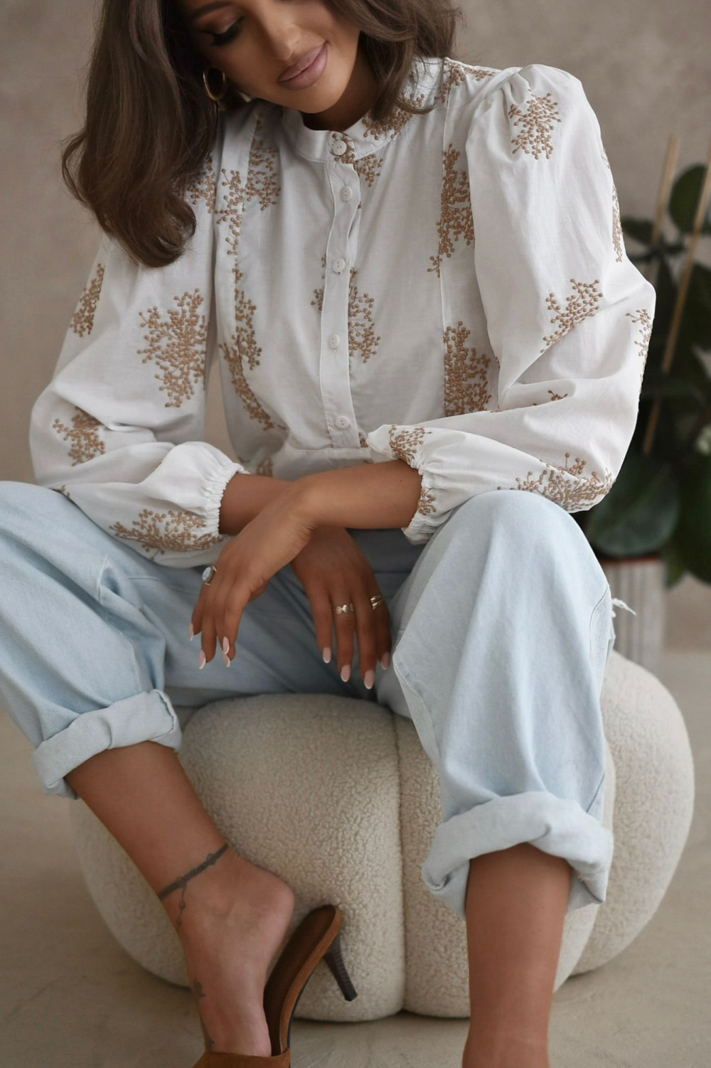 Elegancka damska bluzka w kolorze białym z ozdobnym haftem i stójką. Idealna propozycja na co dzień, do pracy lub na spotkania, łącząca klasyczną elegancję z nowoczesnym designem.