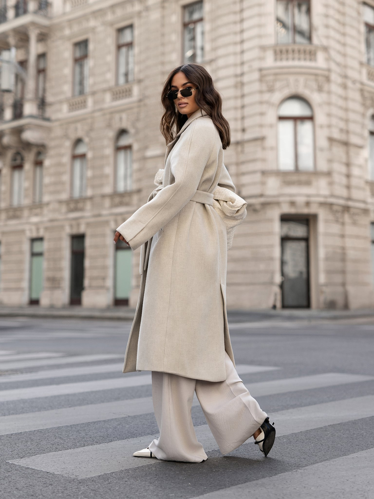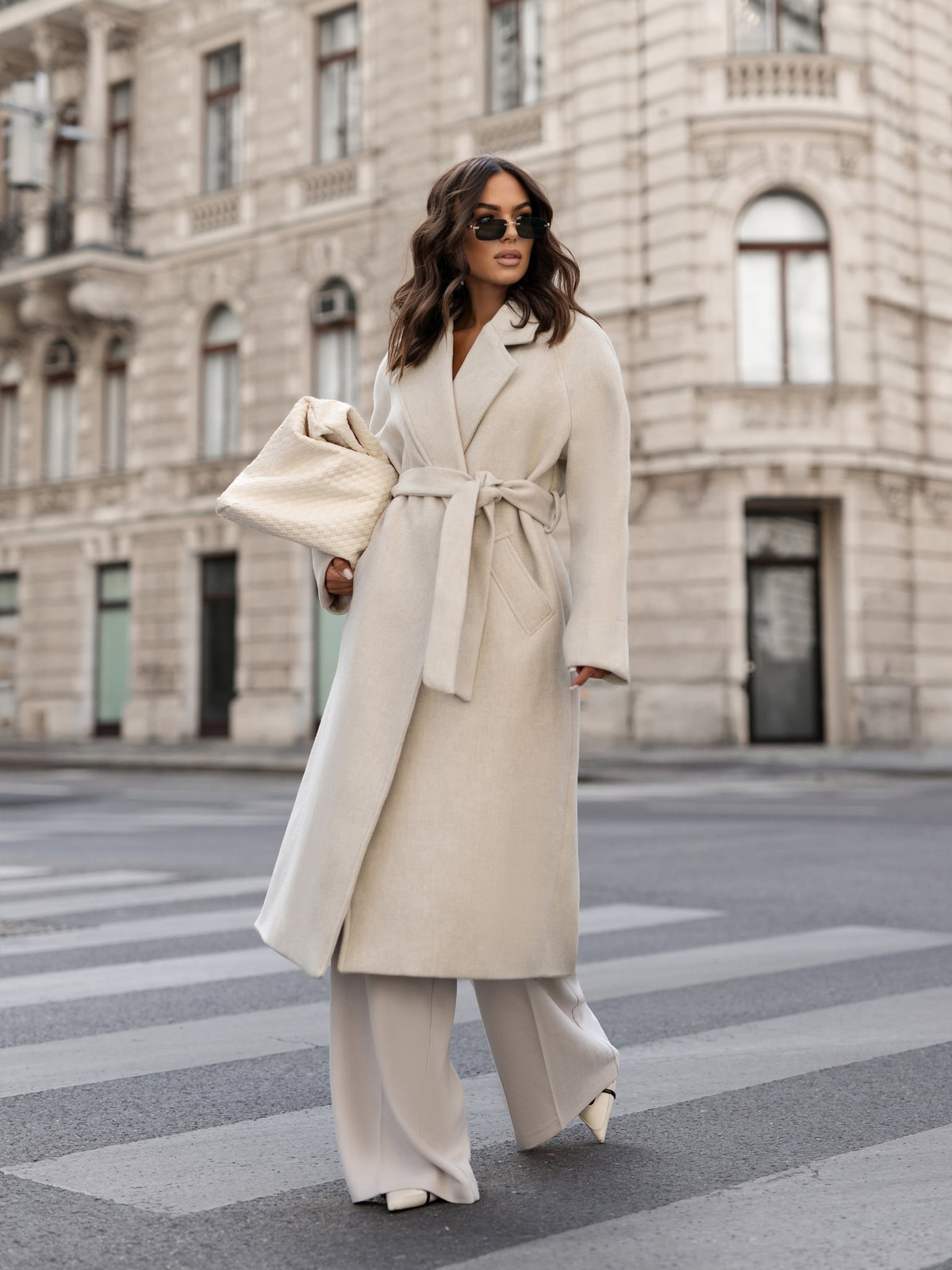 Jasnobeżowy płaszcz damski z paskiem Cocomore– elegancki płaszcz na jesień i zimę