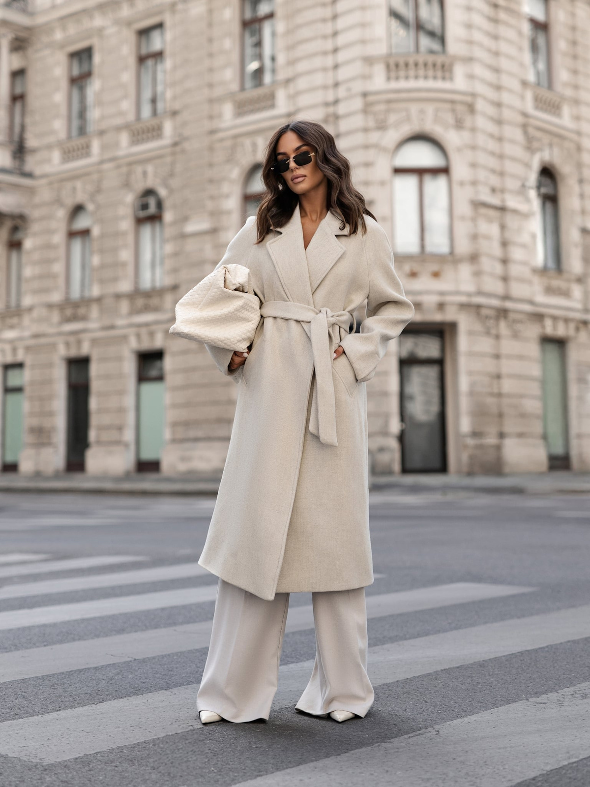 Jasnobeżowy płaszcz damski Cocomore to ponadczasowy wybór do jesienno-zimowych stylizacji. Model o długości midi z paskiem w talii pięknie podkreśla sylwetkę, dodając elegancji i szyku. Wykonany z ciepłej, przyjemnej w dotyku tkaniny, zapewnia komfort w chłodniejsze dni. Płaszcz ma klasyczny kołnierz, praktyczne kieszenie i minimalistyczny krój, dzięki czemu pasuje zarówno do codziennych, jak i wieczorowych stylizacji. Idealny dla kobiet ceniących klasykę w nowoczesnym wydaniu.