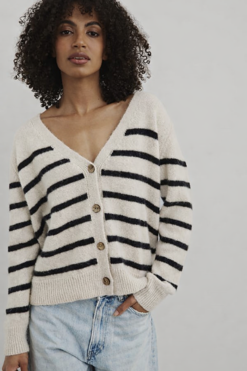 Kardigan damski w paski z przędzy z alpaki Suri to idealny wybór na chłodniejsze dni, łącząc elegancję i komfort. Wykonany z wyjątkowo miękkiej mieszanki alpaki Suri, która słynie z delikatności i subtelnego połysku, zapewnia przyjemne ciepło i luksusowy wygląd. Luźny, oversize'owy krój z długimi rękawami oraz dekoltem w serek sprawia, że jest nie tylko stylowy, ale również wygodny. Zapięcie na drewniane guziki dodaje naturalnego, rustykalnego akcentu, co sprawia, że ten model idealnie sprawdzi się zarówno w codziennych stylizacjach, jak i w bardziej eleganckich zestawieniach.
