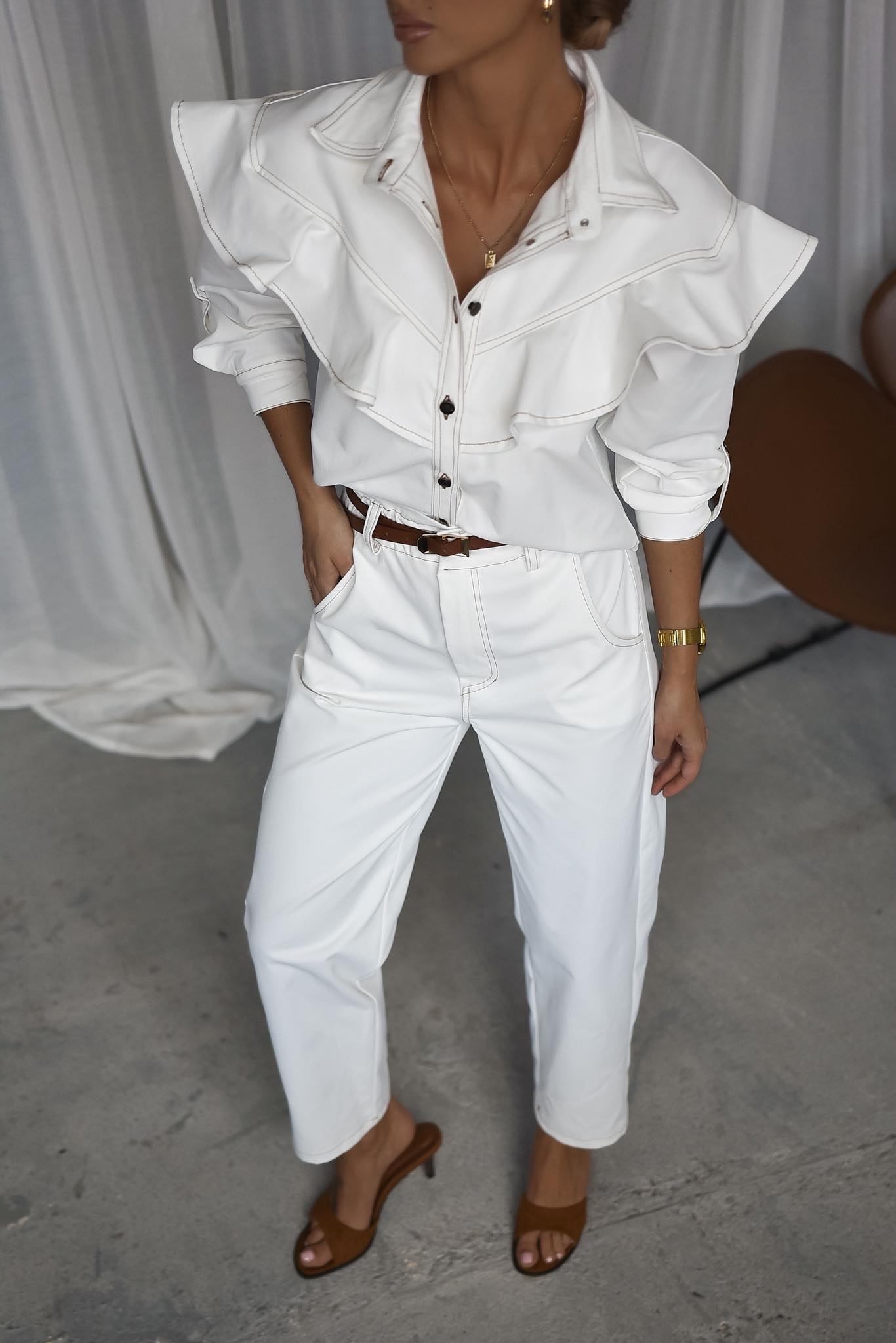 Komplet wykonany z miękkiego, przyjemnego w dotyku materiału, który łączy wygodę z modnym wyglądem. Bluzka z ozdobnymi falbanami dodaje całości lekkości i kobiecego charakteru, a spodnie z wysokim stanem pięknie podkreślają sylwetkę. To stylowy zestaw, który świetnie sprawdzi się zarówno na co dzień, jak i w bardziej dopracowanych stylizacjach.
