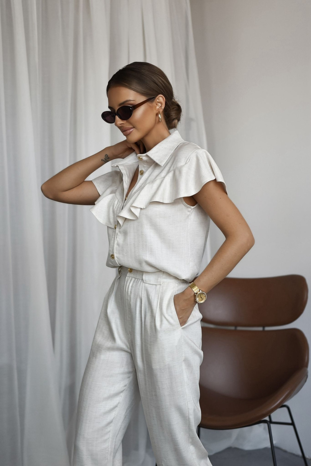 Komplet wykonany z lnianego materiału, który łączy wygodę z modnym wyglądem. Bluzka z ozdobnymi falbanami dodaje całości lekkości i kobiecego charakteru, a spodnie z wysokim stanem pięknie podkreślają sylwetkę. To stylowy zestaw, który świetnie sprawdzi się zarówno na co dzień, jak i w bardziej dopracowanych stylizacjach.