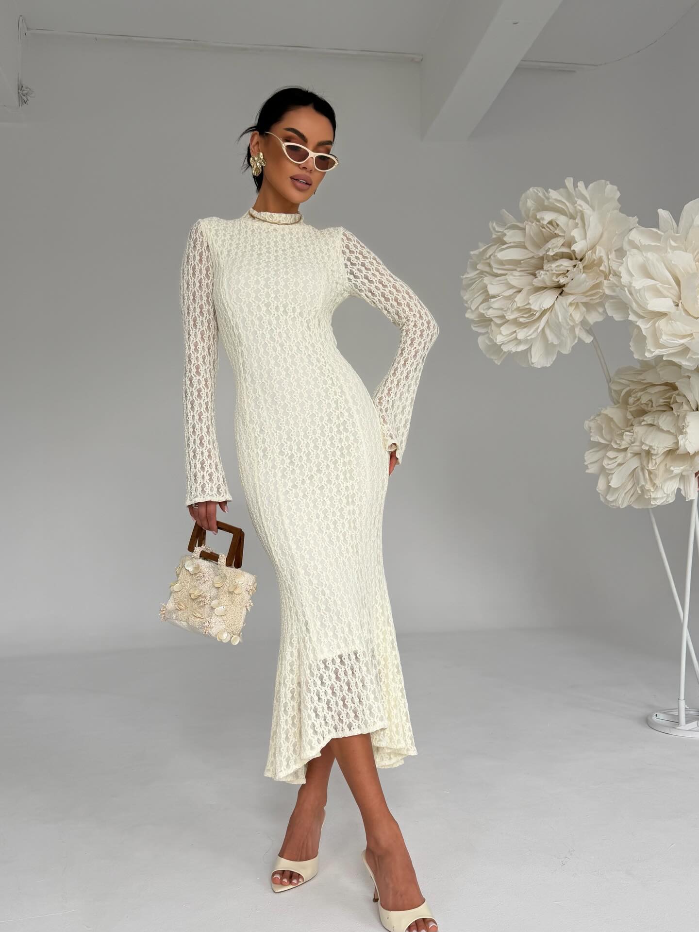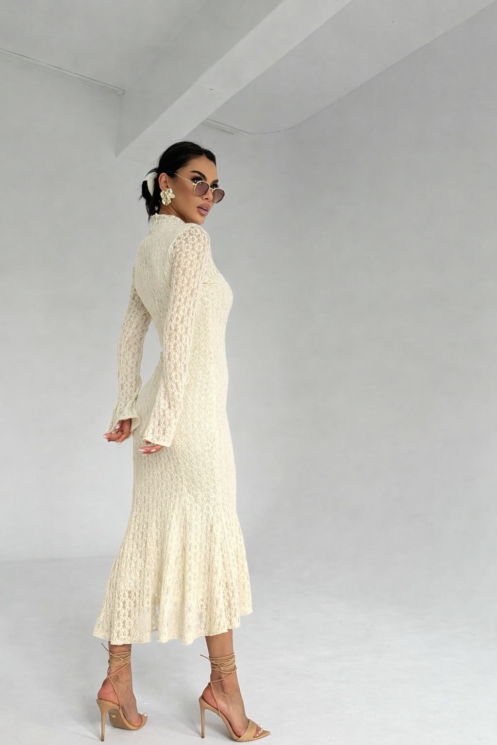 Elegancka maxi sukienka koronkowa w odcieniu ecru to ponadczasowa propozycja dla kobiet ceniących styl i klasę. Dopasowany fason pięknie podkreśla sylwetkę, a delikatna koronka nadaje całości lekkości i subtelnej zmysłowości. Długie rękawy oraz lekko rozkloszowany dół tworzą harmonijną, kobiecą formę idealną zarówno na wyjątkowe okazje, jak i eleganckie wyjścia. Sukienka doskonale komponuje się ze szpilkami i minimalistycznymi dodatkami, tworząc stylizację w duchu nowoczesnej elegancji.