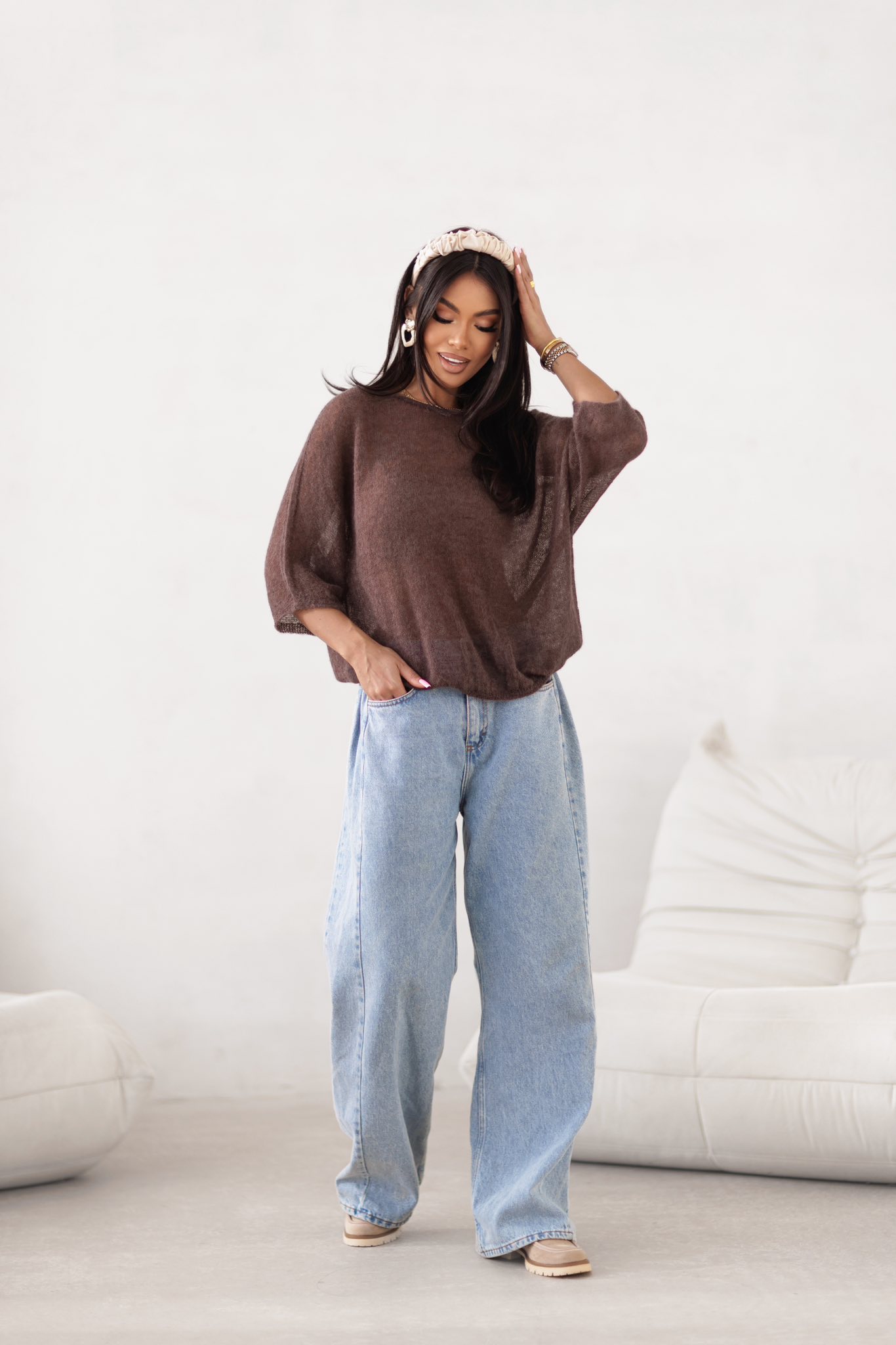 Lekki sweter damski oversize z alpaki Livia czekoladowy