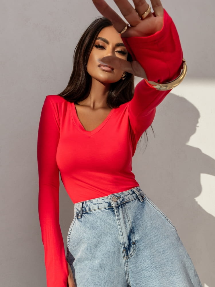 Damskie body to must-have w każdej garderobie! Wykonane z wysokiej jakości, elastycznego materiału, idealnie dopasowuje się do sylwetki. Taliowany krój podkreśla kobiece kształty, a V-dekolt dodaje elegancji. Stylowe rękawy zakładane na palec to modny akcent, który wyróżnia ten model. Świetnie komponuje się z różnymi stylizacjami, nadając im wyjątkowego charakteru. Zapięcie na napy zapewnia wygodę noszenia.