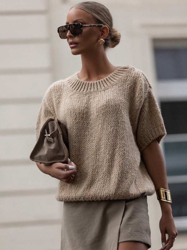 Modny sweter oversize w beżowym kolorze, wykonany z miękkiej, ciepłej przędzy. Idealny do jesienno-zimowych stylizacji, łączy wygodę z ponadczasowym stylem. Świetnie pasuje do jeansów, spódnic i skórzanych legginsów, tworząc stylowy, codzienny look.