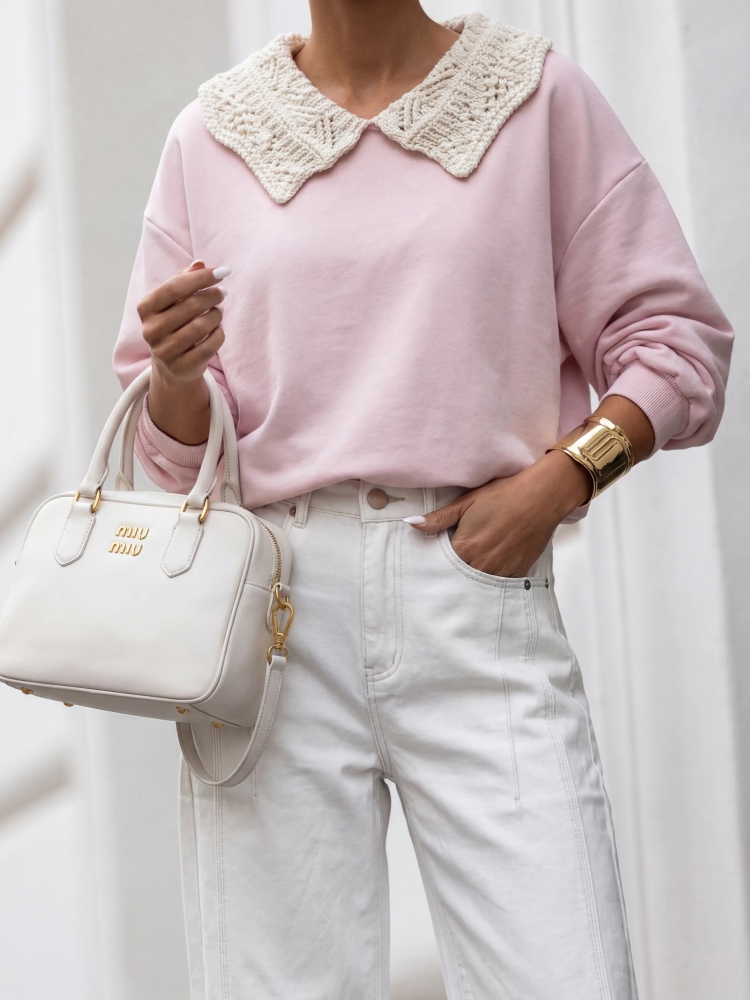 Bluza damska oversize w jasnoróżowym kolorze to idealne połączenie wygody i kobiecego stylu. Ozdobny, koronkowy kołnierzyk nadaje jej eleganckiego charakteru, dzięki czemu sprawdzi się nie tylko w sportowych stylizacjach, ale także w bardziej dopracowanych zestawach. Miękka dzianina i komfortowy krój sprawiają, że to must-have w kategorii bluzy damskie na wiosnę i chłodniejsze dni.