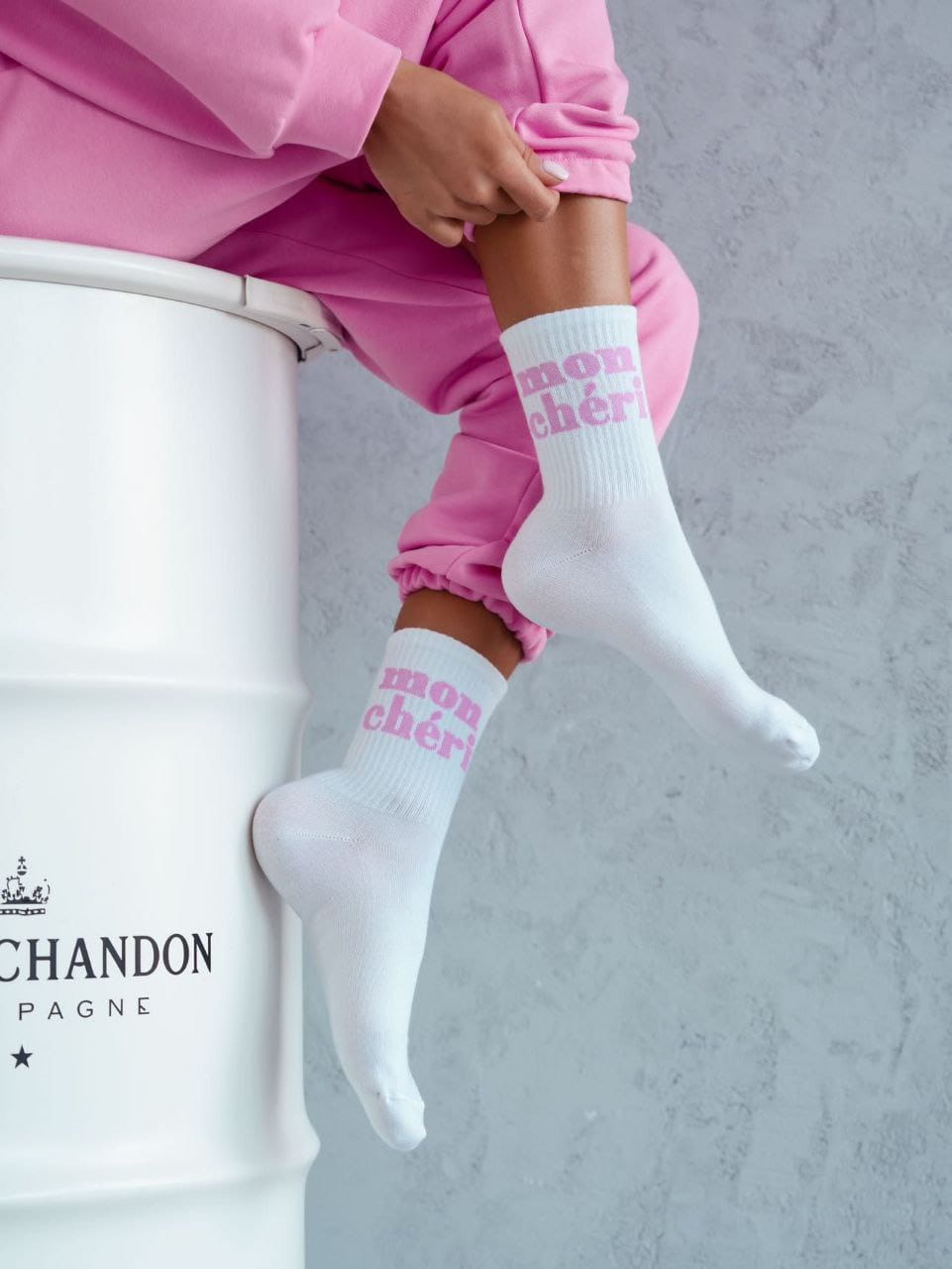 Długie skarpetki z bawełny od polskiego producenta. Biały model z różowym napisem Mon Cheri.