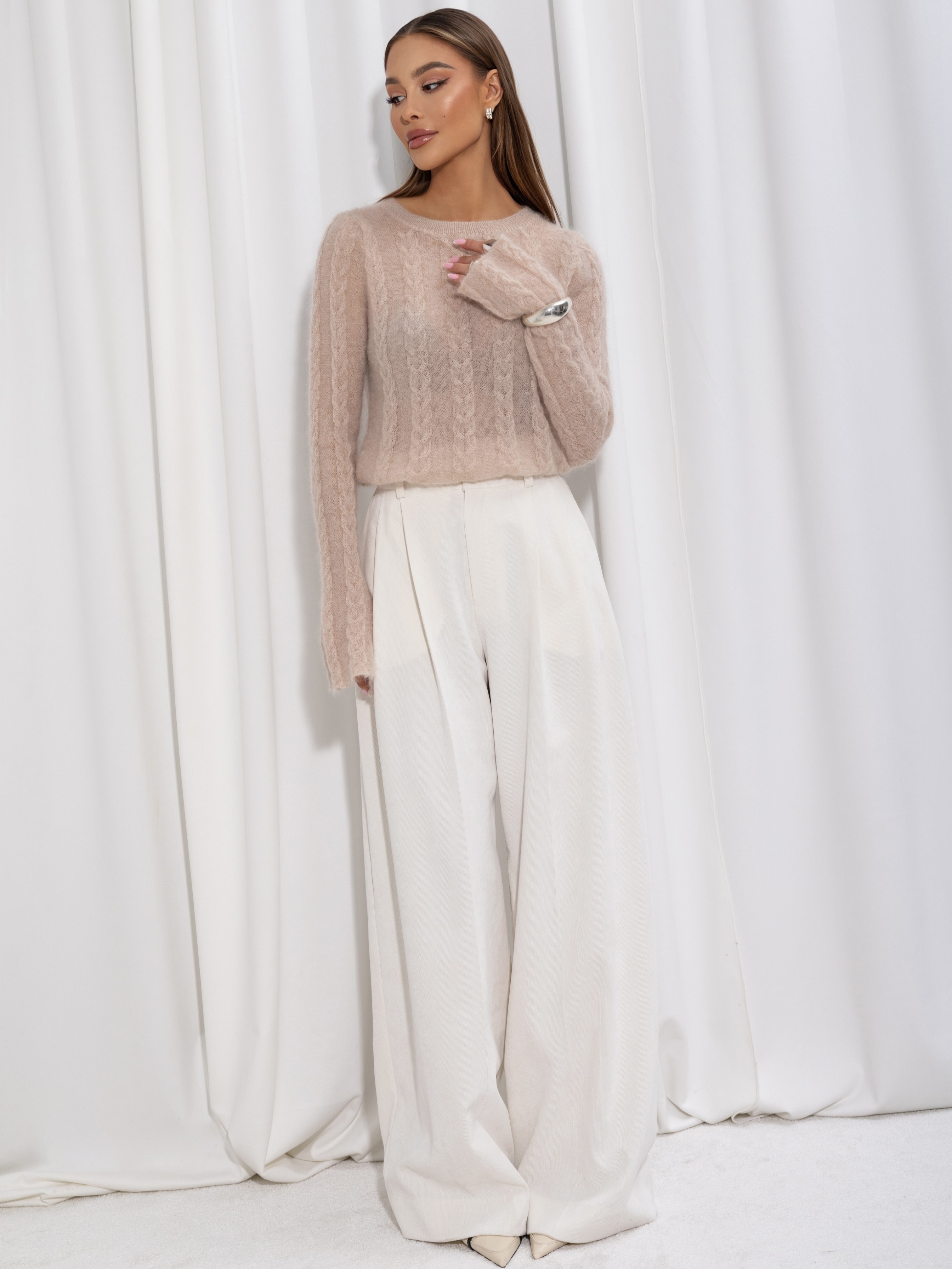Sweter damski ze splotem warkocz premium super kid moher Yarn beżowy